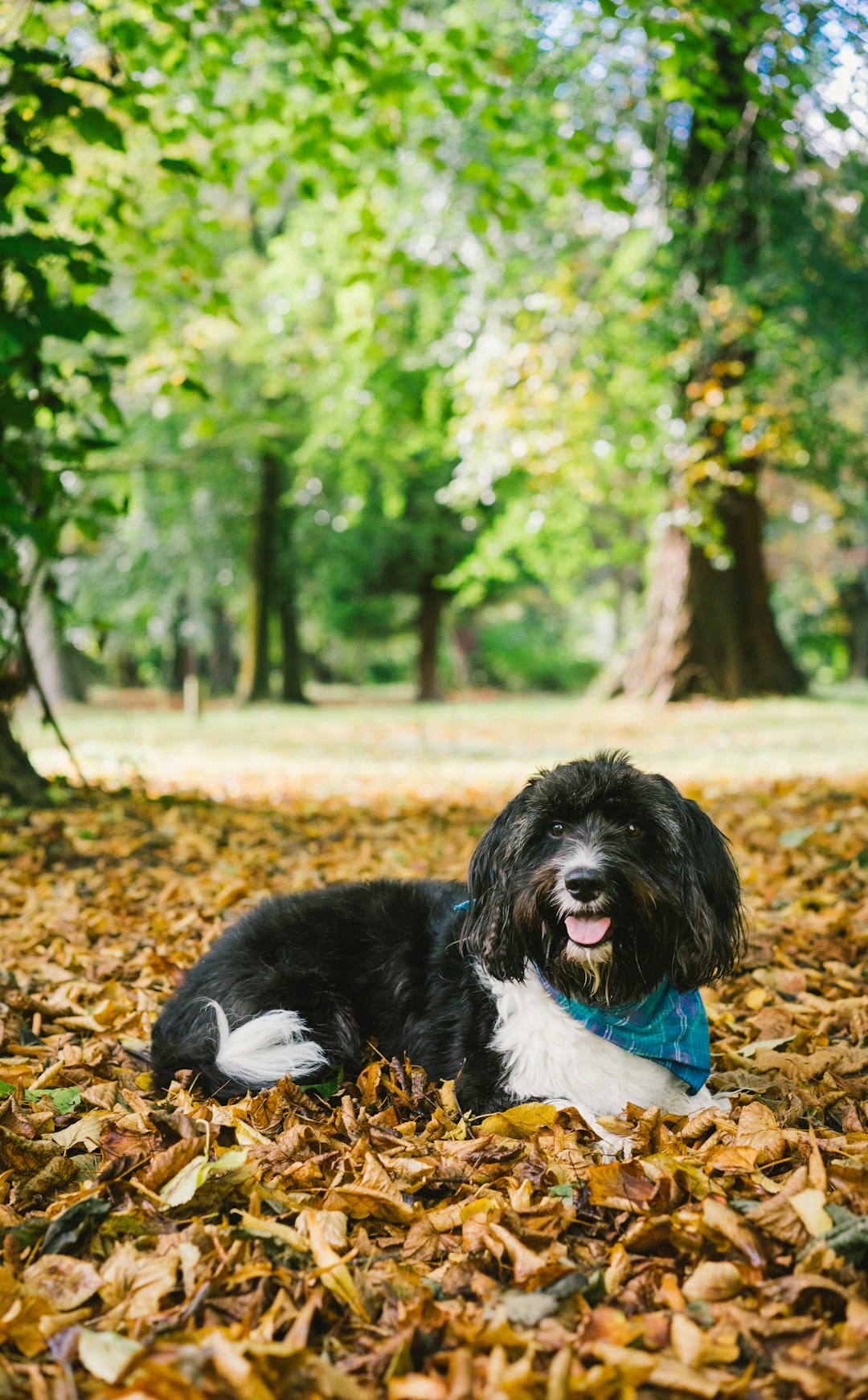 Long pelage soyeux ondulé en plusieurs couleurs, petite taille, queue portée sur le dos, expression joyeuse.
