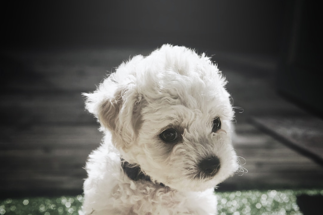 Pelage blanc bouclé en forme de boule de coton, yeux noirs ronds, petit chien compact, expression joyeuse.