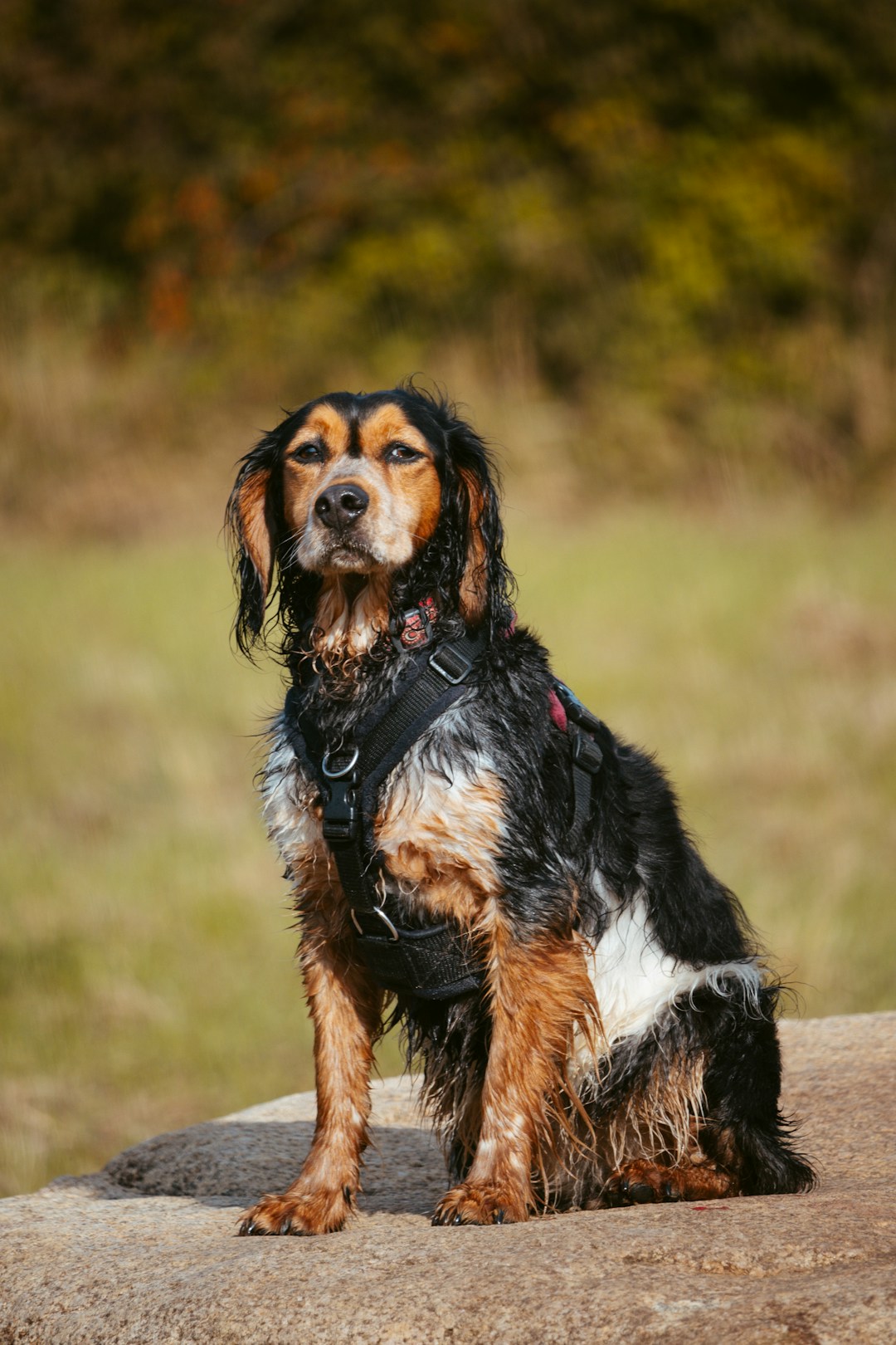 Taille moyenne, longues oreilles tombantes, robe tricolore (noir, blanc, marron), expression douce et curieuse.