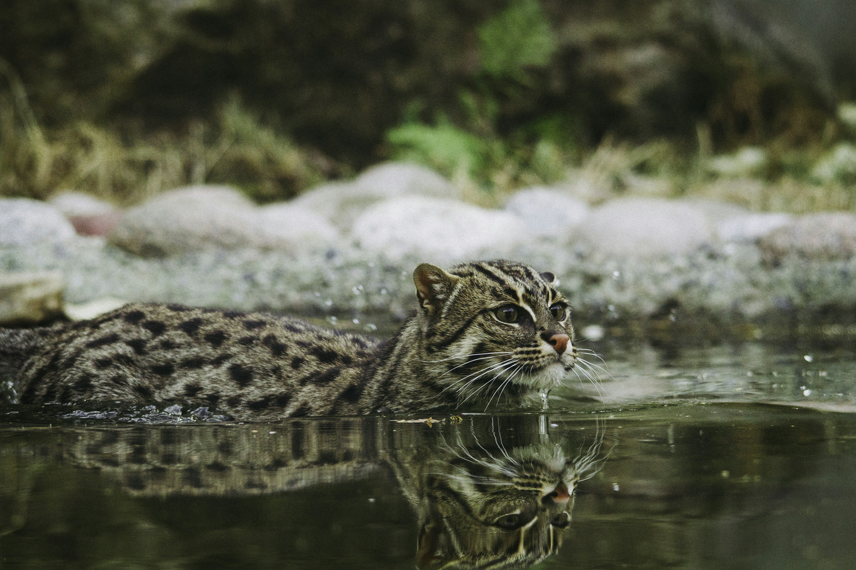 Corps trapu et musclé, pattes partiellement palmées, pelage gris-brun avec rayures et taches, oreilles courtes et arrondies.
