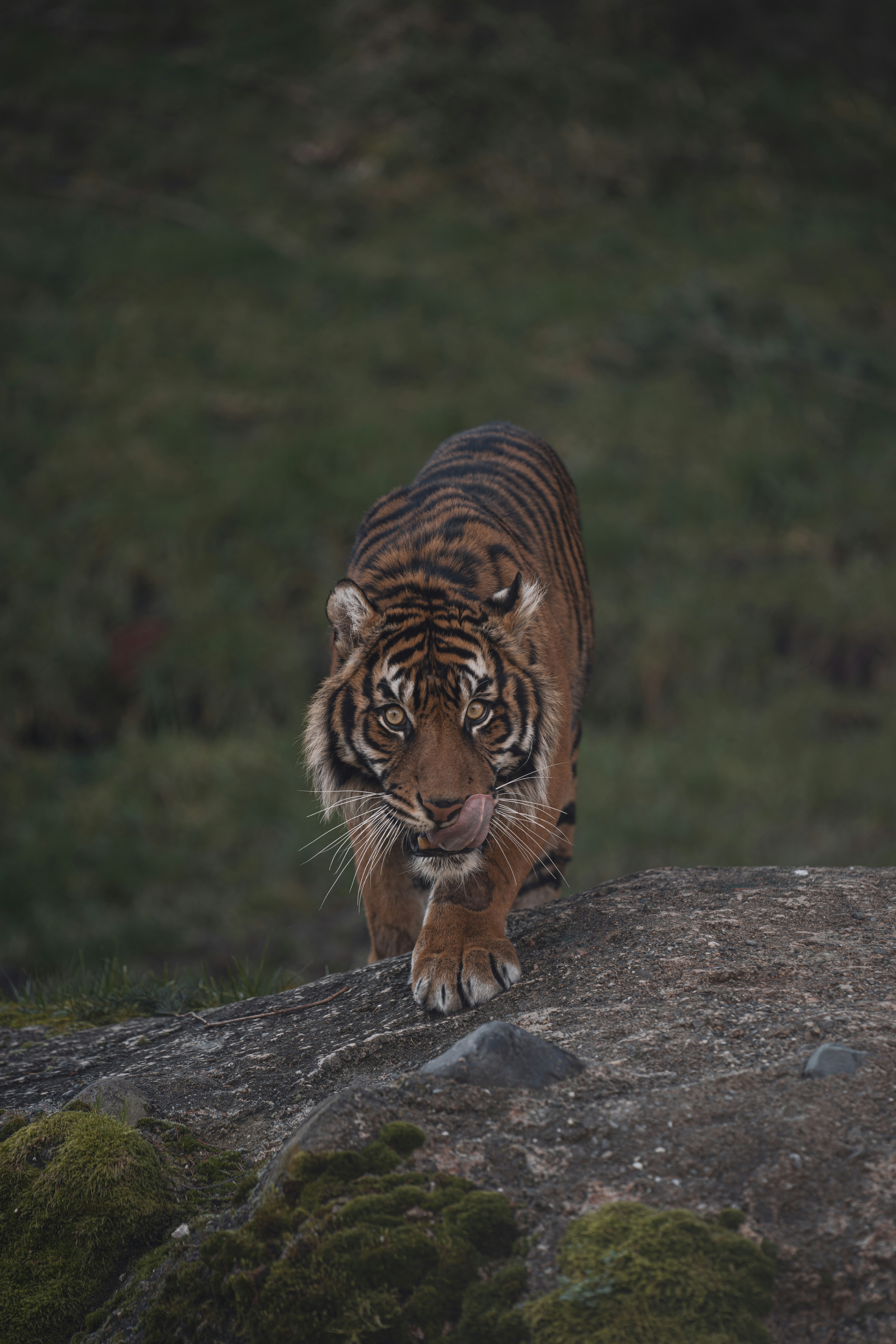 Plus petit tigre, rayures très rapprochées et nombreuses, fourrure orange foncé, favoris plus développés.