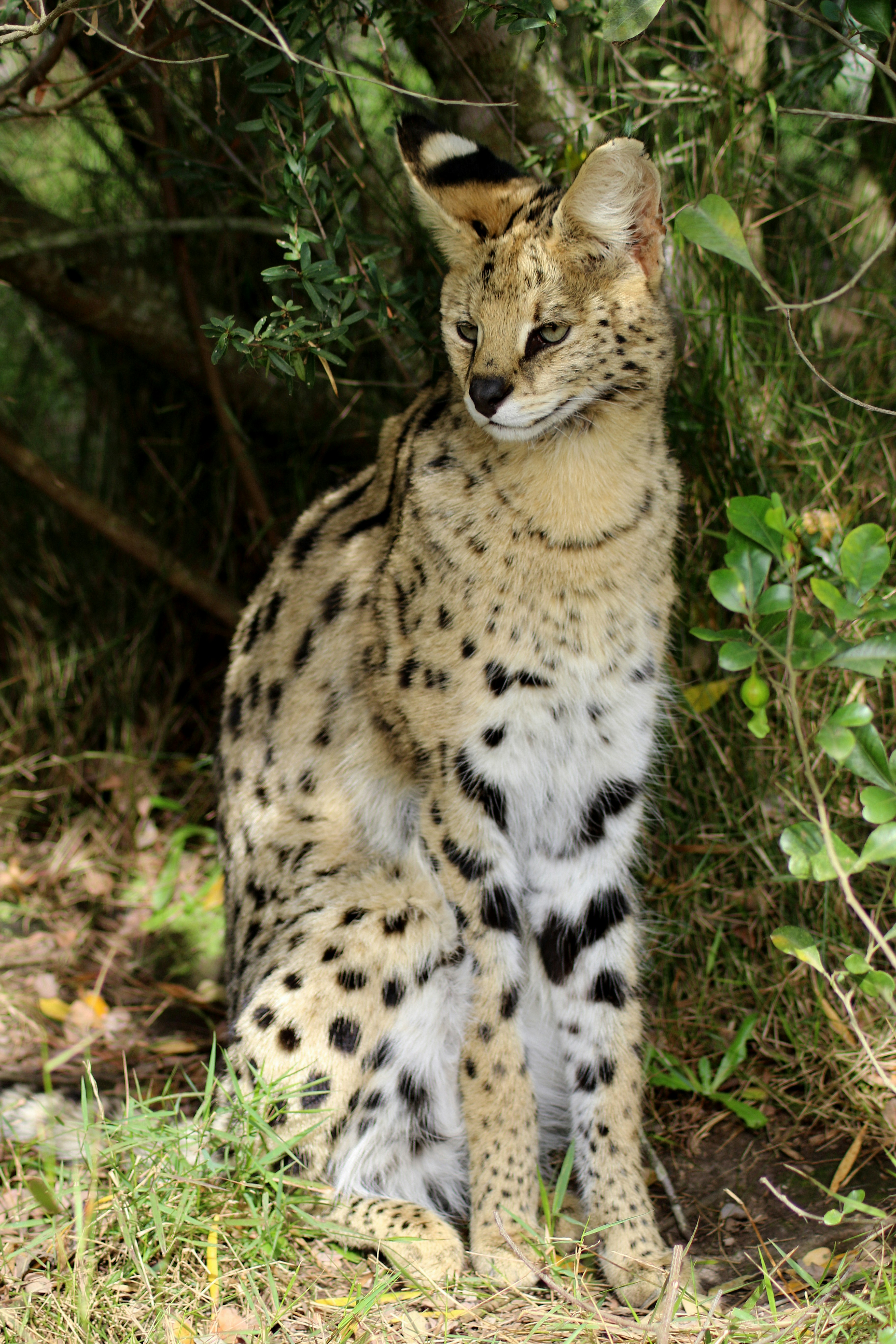 Très longues pattes, grandes oreilles ovales, petite tête, taches et rayures noires sur fond doré, cou allongé.